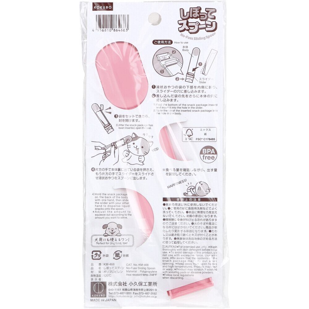 (4)片方の手で本体裏に出ている袋を押さえ、もう片方の手でスライダーをスライドさせ液状おやつをスプーンに出します。
