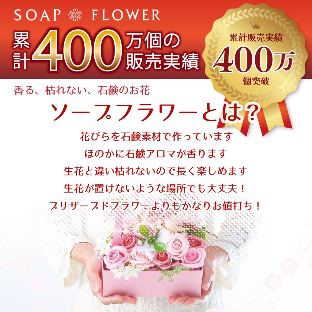 ほのかな香りとボリューム感たっぷりで華やか、石けんで出来ているため枯れることなくお手入れ不要です。