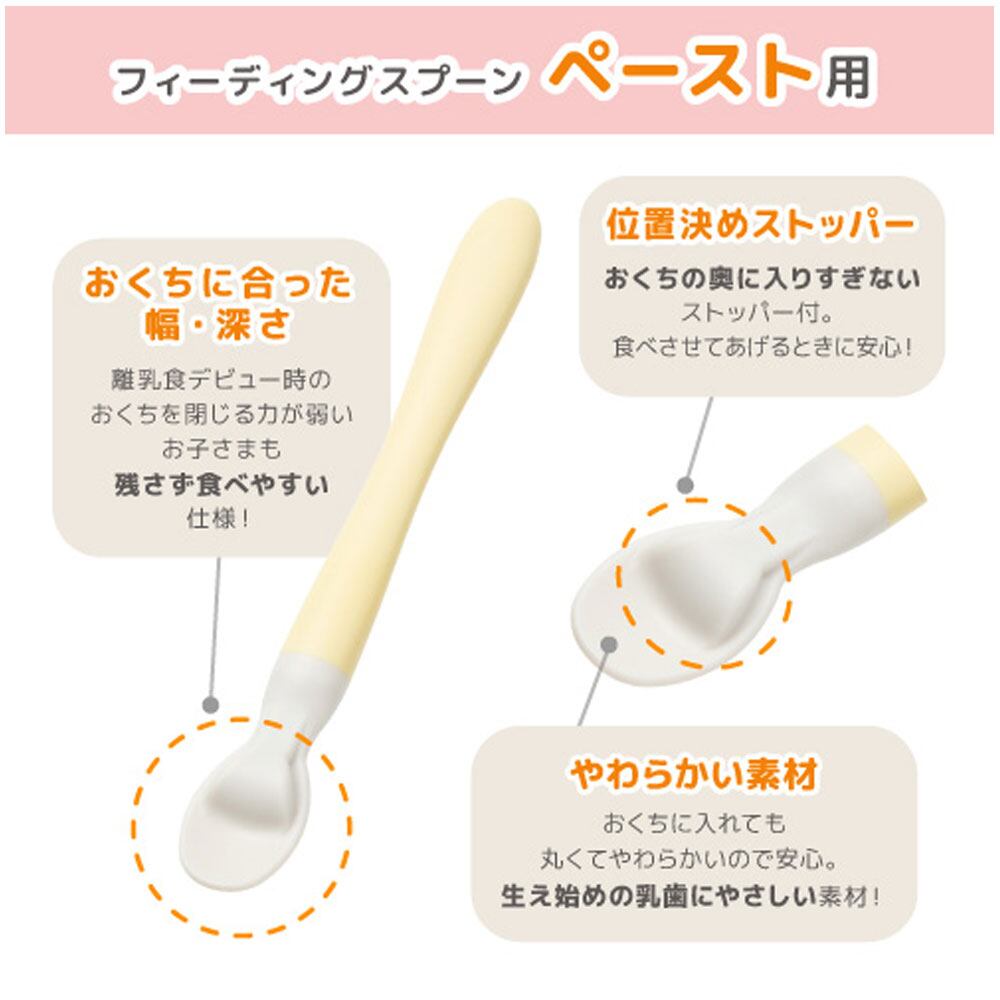 ・フィーディングスプーンの先端は、柔らかい素材の為、すり鉢状の食器や、食材の裏ごしへのご使用はお控えください。