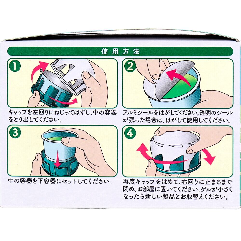 (4)再度キャップをはめて、右回りに止まるまで閉め、お部屋に置いてください。ゲルが小さくなったら新しい製品とお取替えください。