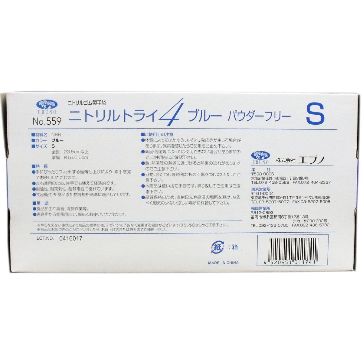 【業務用】No.559 ニトリルトライ4 ブルー パウダーフリー ニトリルゴム製 使い捨て手袋 Sサイズ 100枚入