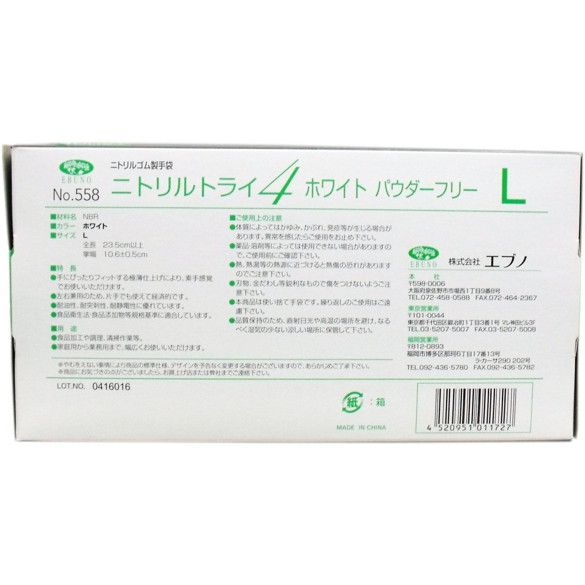 【業務用】No.558 ニトリルトライ4 ホワイト パウダーフリー ニトリルゴム製 使い捨て手袋 Lサイズ 100枚入