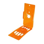 (2)誘引剤袋を破り、中身を容器の中央部のくぼみに絞りだし、その上に穴あきシールを貼りつけてください。吊り下げフックを使用する場合は、フックを内側に引き起こしてください。