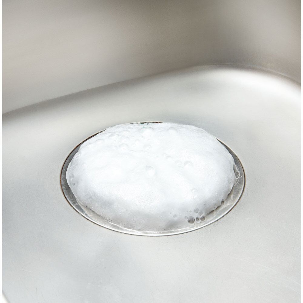 排水口に粉を入れてお湯を注ぐだけ。モコモコ泡立ち、酸素でしっかり洗浄。