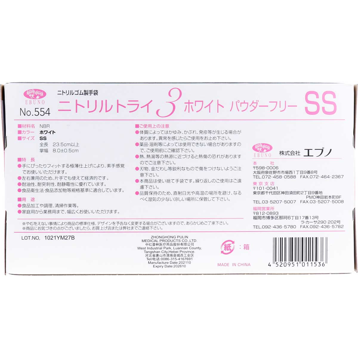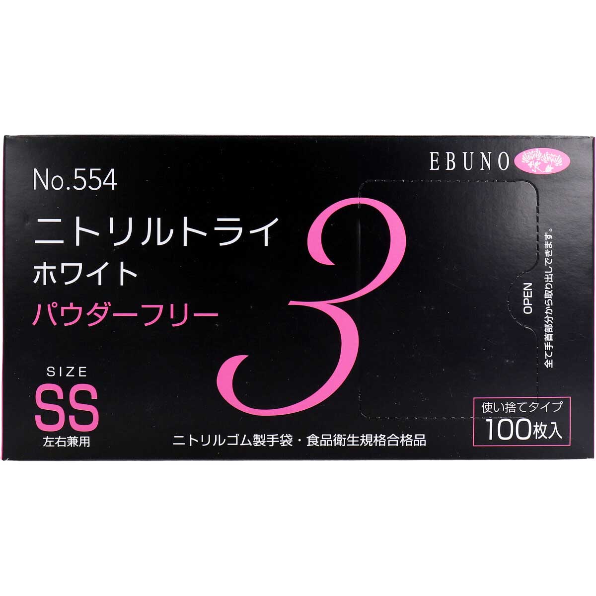 業務用No.554 ニトリルトライ3 ホワイト パウダーフリー ニトリルゴム 使捨手袋 SS 100枚