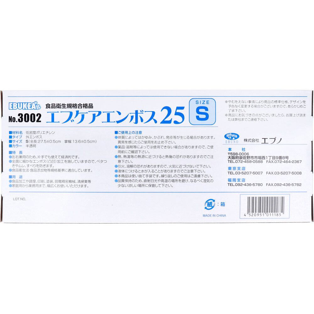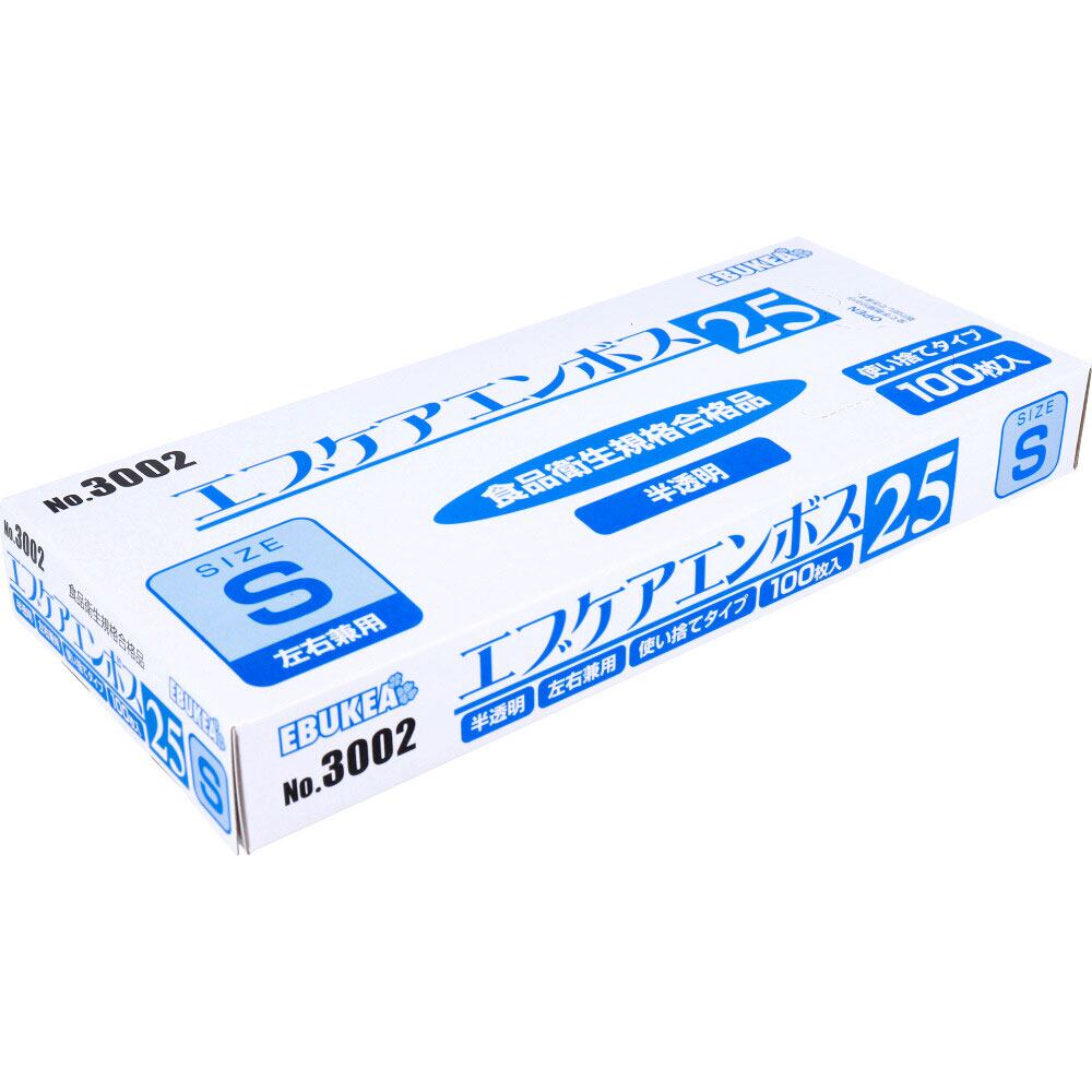 【業務用】No.3002 エブケアエンボス25 食品衛生法適合 使い捨て手袋半透明 Sサイズ 箱入 100枚入