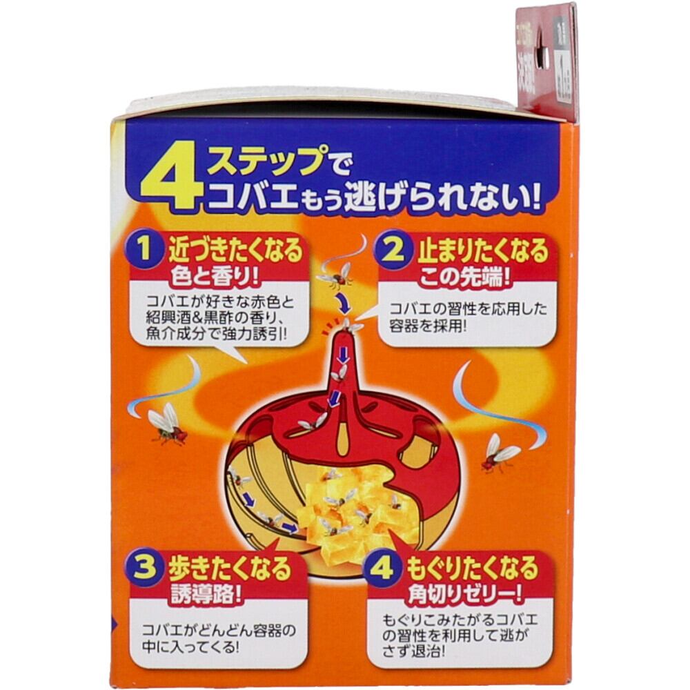 ●紹興酒と黒酢の香りでコバエを「強力誘引」。止まり木効果のある容器に「止まらせ・容器内に誘導」、「ゼリーに潜らせ・退治」するシステムです。