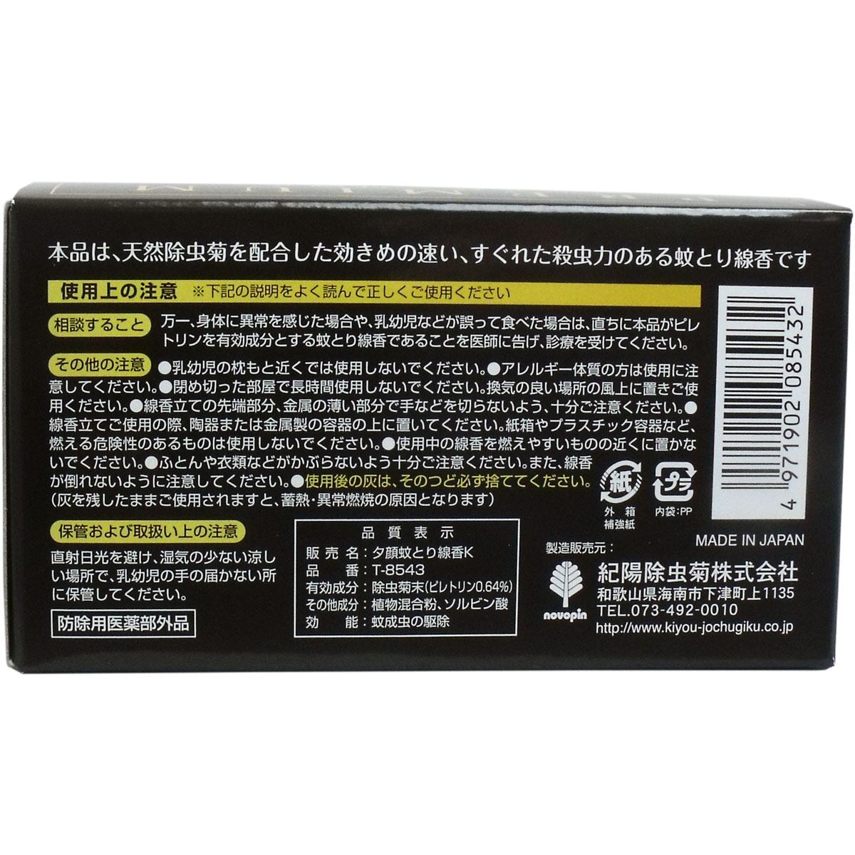 ・万一、身体に異常を感じた場合や乳幼児などが誤って食べた場合は、直ちに本品がピレトリンを有効成分とする蚊取り線香であることを医師に告げ、診療を受けてください。
