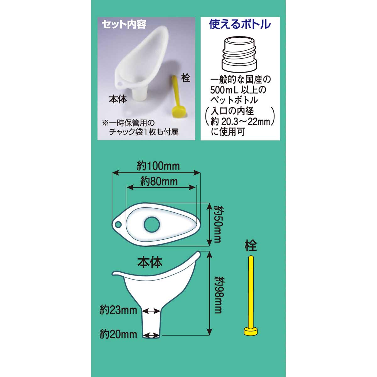 使用後ボトルをしっかり抑えながら本体を外し、中身を必ずトイレに流してからペットボトルを洗浄または処分してください。本体、栓、チャック袋は水または中性洗剤で洗い、日陰干ししてください。