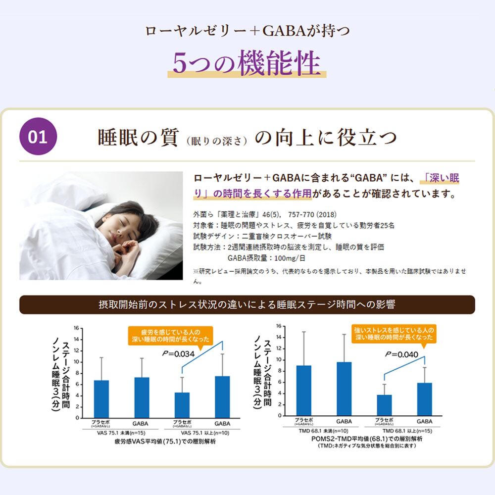 ローヤルゼリー+GABAに含まれる「GABA」には、「深い眠り」の時間を長くする作用があることが確認されています。