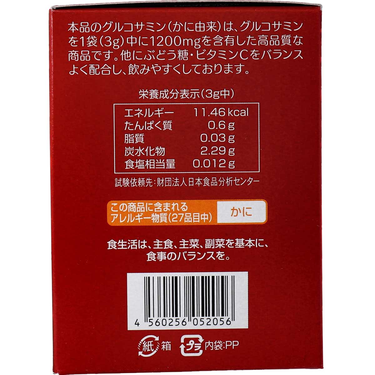 本品のグルコサミン(かに由来)は国産のグルコサミンを1袋(3g)中に1200mgを含有した高品質な商品です。他にぶどう糖・ビタミンCをバランスよく配合し、飲みやすくしております。