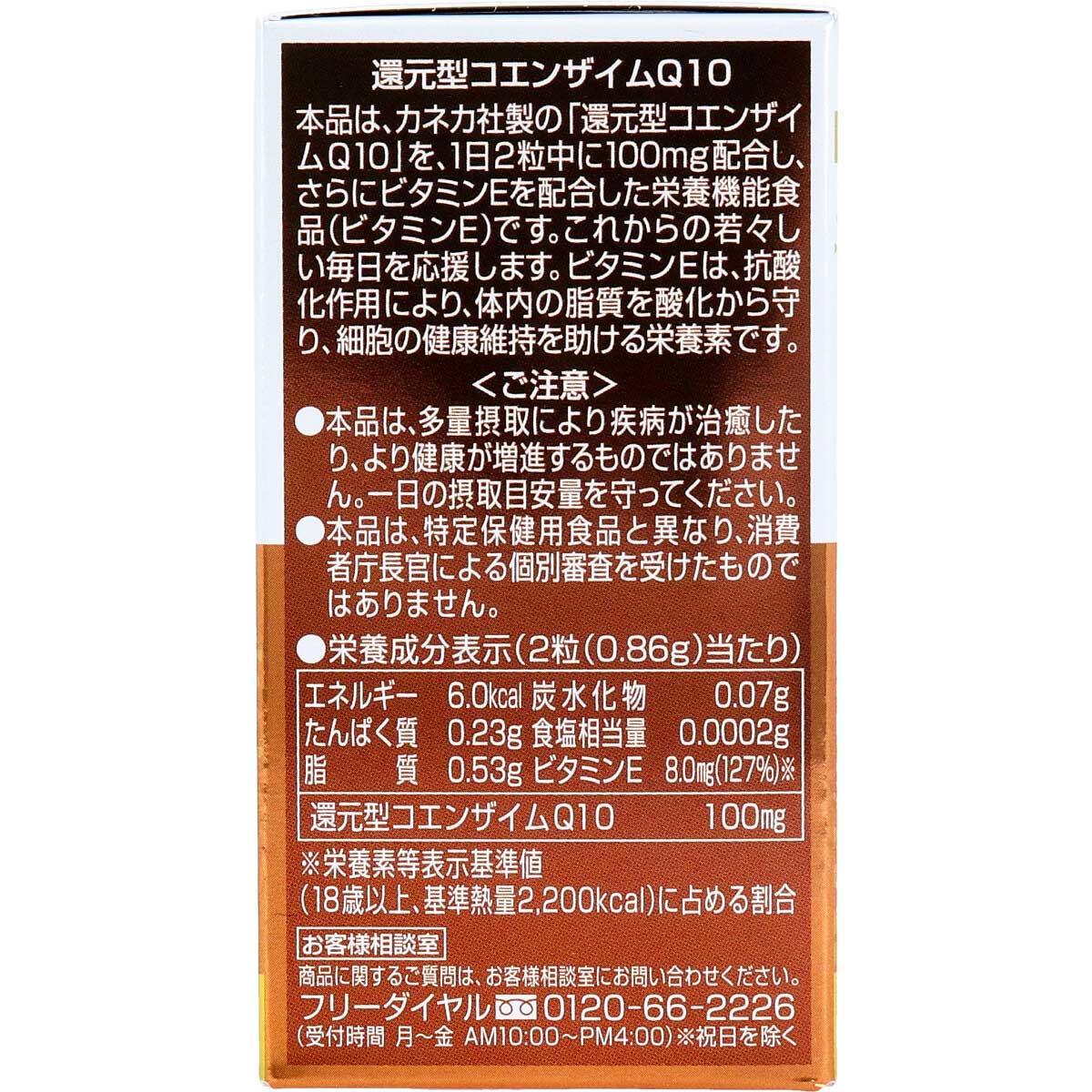 カネカ社製の「還元型コエンザイムQ10」を1日2粒中に100mg配合し、さらにビタミンEを配合した栄養機能食品です。