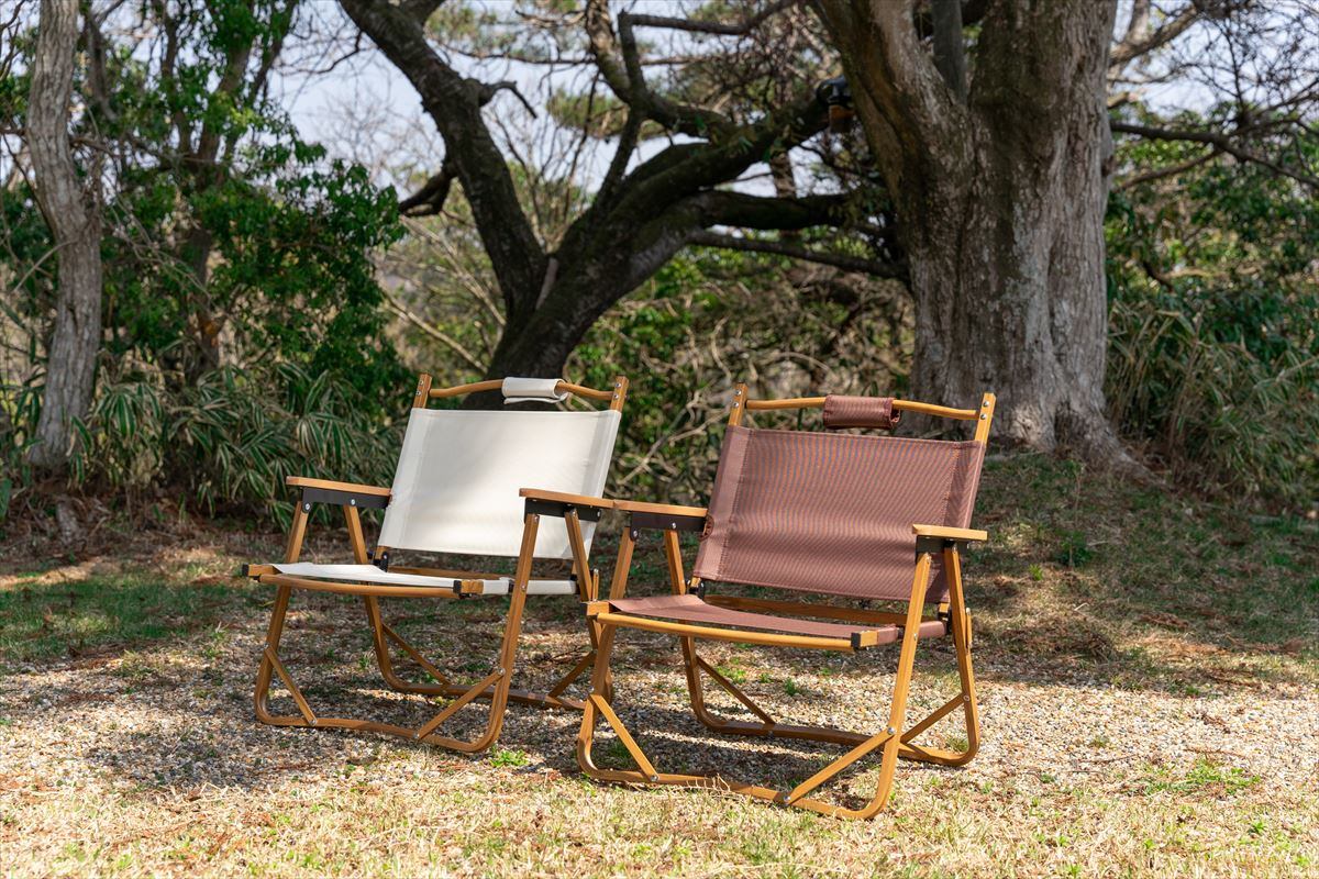 木目調のアルミフレームと天然木のアームレストがナチュラルな雰囲気を演出する折りたたみアウトドアチェア