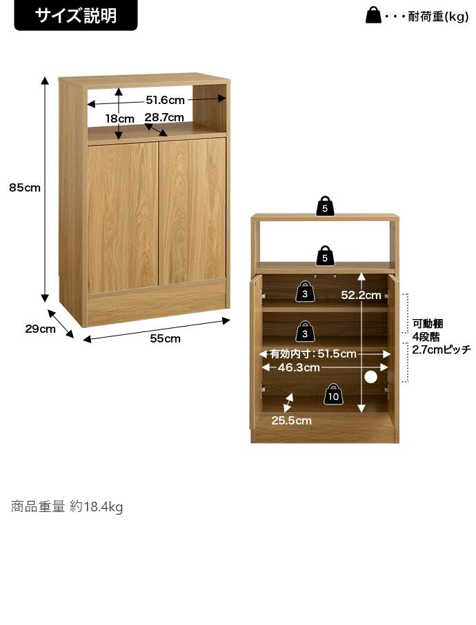 【耐荷重】天板:約5kg 、オープン収納:約5kg、棚板:各約3kg、扉内収納底板:約10kg