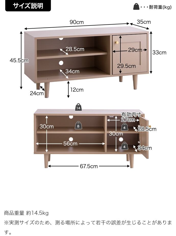 【耐荷重】天板:約14kg、棚板(オープン収納):約8kg、棚板(扉収納):約4kg、底板(扉収納):約4kg
